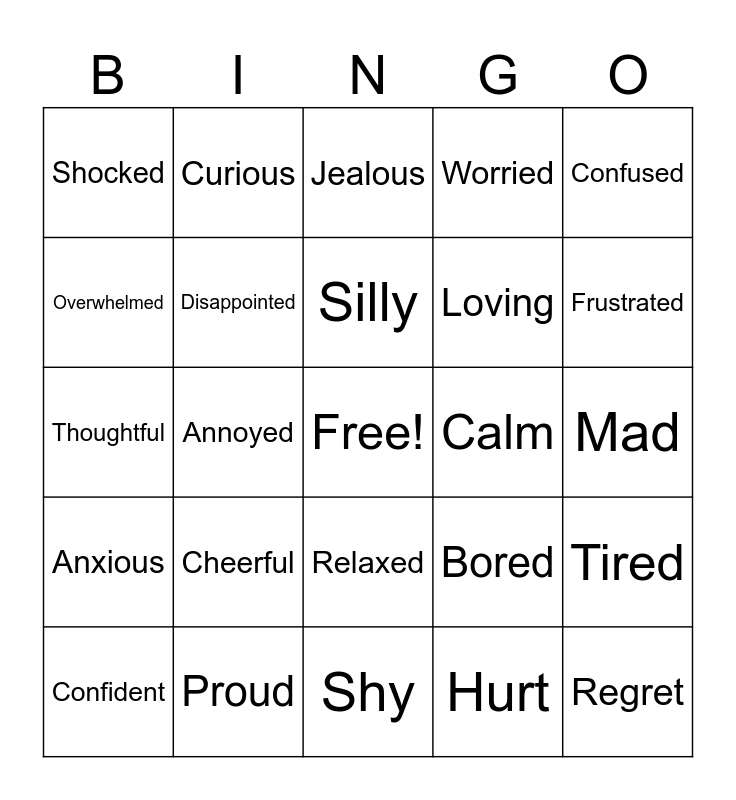 This bingo card has a free space and 24 words: Cheerful, Proud, Silly, Confident, Confused, Shocked, Overwhelmed, Curious, Calm, Relaxed, Loving, Thoughtful, Bored, Tired, Disappointed, Hurt, Mad, Jealous, Frustrated, Annoyed, Regret, Anxious, Worried and Shy.