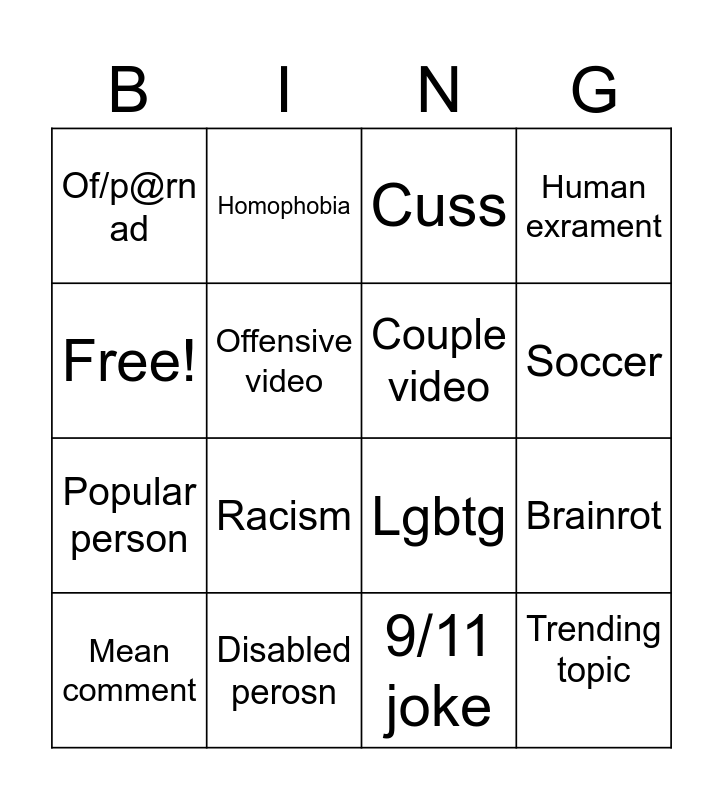 This bingo card has 16 words: Disabled perosn, Brainrot, Cuss, Of/p@rn ad, Popular person, Homophobia, Lgbtg, 9/11 joke, Free!, Offensive video, Mean comment, Human exrament, Racism, Soccer, Couple video and Trending topic.