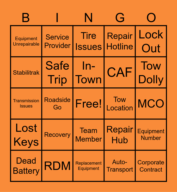 This bingo card has a free space and 29 words: Dead Battery, Customer Pay, Roadside Go, Mobile Mavericks, Equipment Unrepairable, Tire Issues, Safe Trip, Recovery, Tow Location, RDM, MCO, Corporate Contract, Replacement Equipment, Auto-Transport, Tow Dolly, Tire Strap, Team Member, Lost Keys, Lock Out, Transmission Issues, Repair Hub, Out of Fuel, CAF, Stabilitrak, Repair Hotline, Service Provider, Equipment Number, In-Town and One Way.