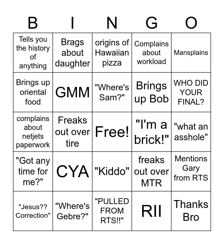 This bingo card has a free space and 24 words: CYA, "Where's Gebre?", "Where's Sam?", "Jesus?? Correction", Mansplains, Tells you the history of anything, Brings up oriental food, Brags about daughter, "I'm a brick!", "Kiddo", Brings up Bob, complains about netjets paperwork, freaks out over MTR, Mentions Gary from RTS, GMM, RII, "what an asshole", origins of Hawaiian pizza, WHO DID YOUR FINAL?, Freaks out over tire, Thanks Bro, "Got any time for me?", Complains about workload and "PULLED FROM RTS!!".