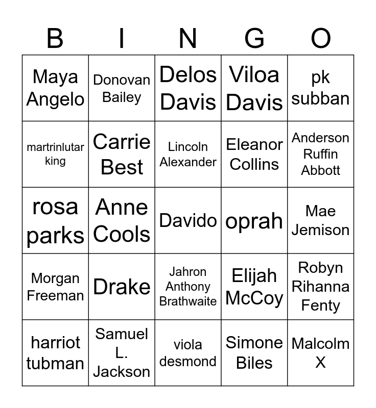 This bingo card has 25 words: Drake, viola desmond, Lincoln Alexander, harriot tubman, pk subban, Maya Angelo, martrinlutar king, Donovan Bailey, oprah, Jahron Anthony Brathwaite, Eleanor Collins, rosa parks, Elijah McCoy, Robyn Rihanna Fenty, Carrie Best, Malcolm X, Mae Jemison, Delos Davis, Anderson Ruffin Abbott, Anne Cools, Davido, Samuel L. Jackson, Morgan Freeman, Viloa Davis and Simone Biles.