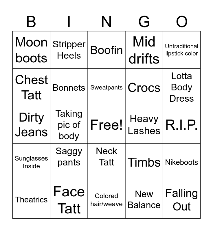 This bingo card has a free space and 24 words: Saggy pants, Face Tatt, Sweatpants, Theatrics, Untraditional lipstick color, Moon boots, Chest Tatt, Stripper Heels, Heavy Lashes, Neck Tatt, Crocs, Dirty Jeans, Timbs, Nikeboots, Bonnets, New Balance, R.I.P., Boofin, Lotta Body Dress, Taking pic of body, Falling Out, Sunglasses Inside, Mid drifts and Colored hair/weave.