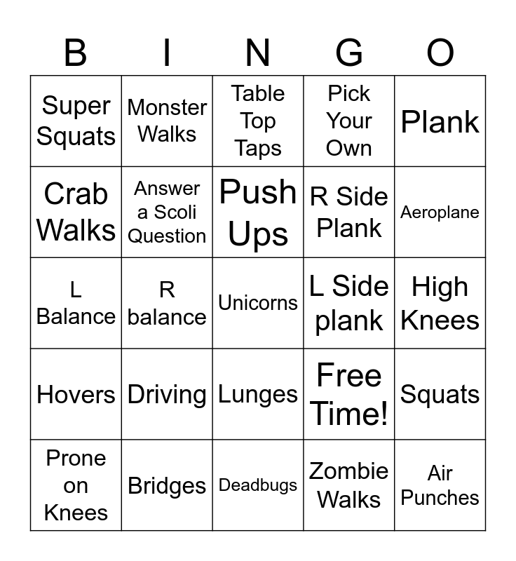 This bingo card has 25 words: Driving, Deadbugs, Push Ups, Prone on Knees, Plank, Super Squats, Crab Walks, Monster Walks, L Side plank, Lunges, R Side Plank, L Balance, Free Time!, Squats, Answer a Scoli Question, Air Punches, High Knees, Table Top Taps, Aeroplane, R balance, Unicorns, Bridges, Hovers, Pick Your Own and Zombie Walks.