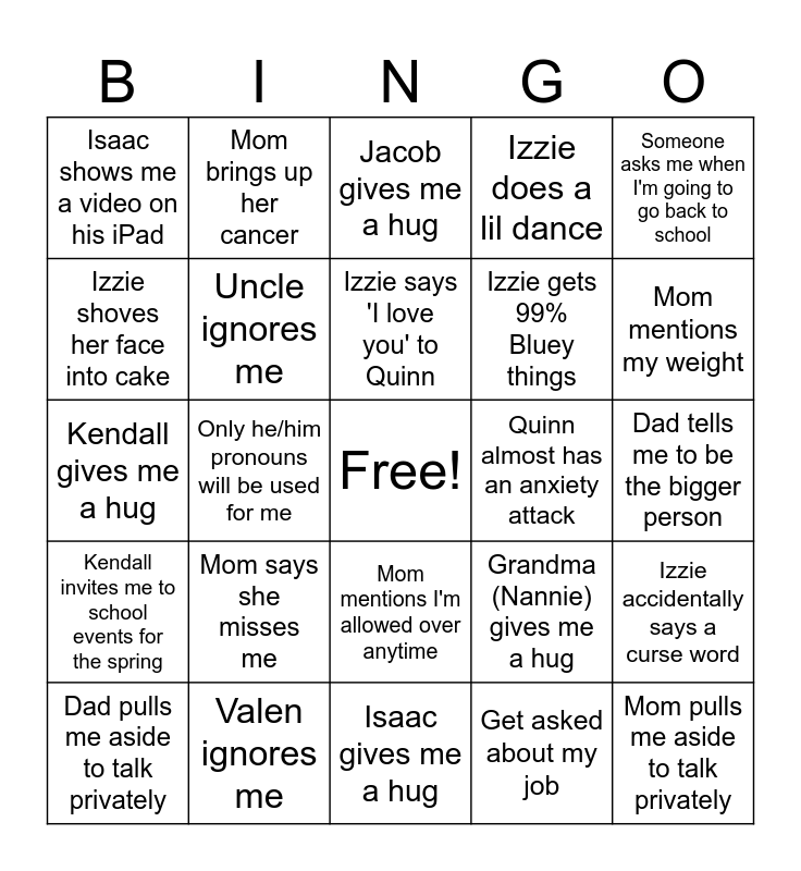 This bingo card has a free space and 24 words: Mom says she misses me, Valen ignores me, Izzie says 'I love you' to Quinn, Dad pulls me aside to talk privately, Someone asks me when I'm going to go back to school, Isaac shows me a video on his iPad, Izzie shoves her face into cake, Mom brings up her cancer, Quinn almost has an anxiety attack, Mom mentions I'm allowed over anytime, Izzie gets 99% Bluey things, Kendall gives me a hug, Grandma (Nannie) gives me a hug, Izzie accidentally says a curse word, Uncle ignores me, Get asked about my job, Dad tells me to be the bigger person, Jacob gives me a hug, Mom mentions my weight, Only he/him pronouns will be used for me, Mom pulls me aside to talk privately, Kendall invites me to school events for the spring, Izzie does a lil dance and Isaac gives me a hug.