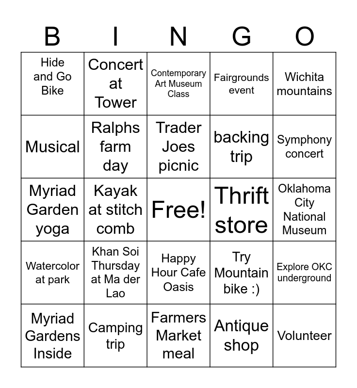 This bingo card has a free space and 24 words: Khan Soi Thursday at Ma der Lao, Camping trip, Trader Joes picnic, Myriad Gardens Inside, Wichita mountains, Hide and Go Bike, Musical, Concert at Tower, Thrift store, Happy Hour Cafe Oasis, backing trip, Myriad Garden yoga, Try Mountain bike :), Explore OKC underground, Ralphs farm day, Antique shop, Oklahoma City National Museum, Contemporary Art Museum Class, Symphony concert, Kayak at stitch comb, Volunteer, Watercolor at park, Fairgrounds event and Farmers Market meal.