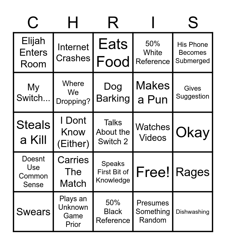 This bingo card has 25 words: Carries The Match, 50% Black Reference, Dog Barking, Swears, His Phone Becomes Submerged, Elijah Enters Room, My Switch..., Internet Crashes, Watches Videos, Speaks First Bit of Knowledge, Makes a Pun, Steals a Kill, Free!, Rages, Where We Dropping?, Dishwashing, Okay, Eats Food, Gives Suggestion, I Dont Know (Either), Talks About the Switch 2, Plays an Unknown Game Prior, Doesnt Use Common Sense, 50% White Reference and Presumes Something Random.