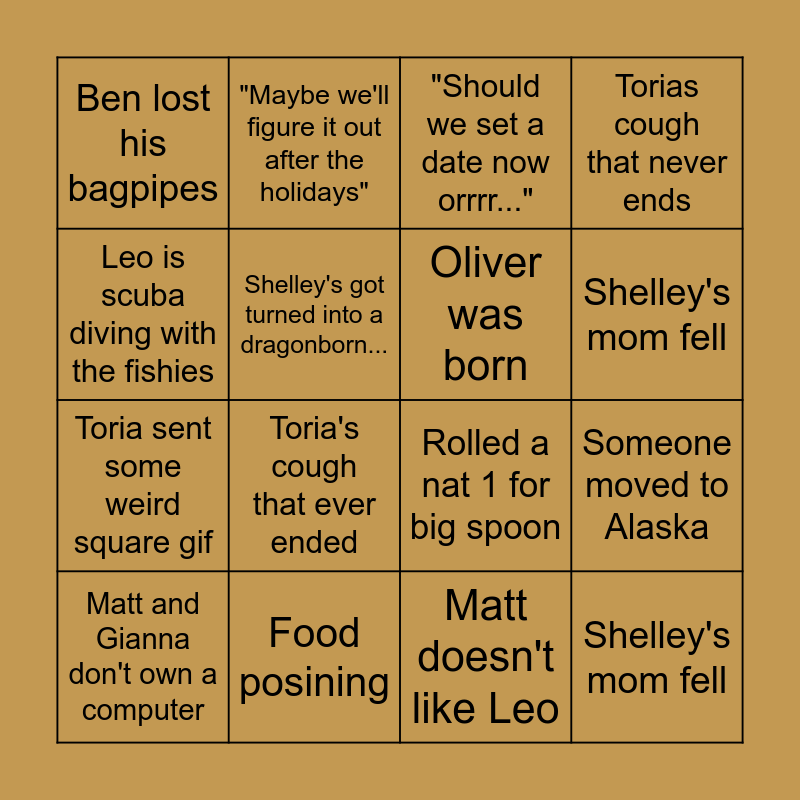 This bingo card has 19 words: Rolled a nat 1 for big spoon, Gianna got toria's cough that never ended, "Should we set a date now orrrr...", Shelley's mom fell, Someone moved to Alaska, Leo is scuba diving with the fishies, Matt doesn't like Leo, Ben lost his bagpipes, "Maybe we'll figure it out after the holidays", Toria sent some weird square gif, Toria's cough that ever ended, Shelley's got turned into a dragonborn..., Oliver was born, Food posining, Matt and Gianna don't own a computer, Matt's sick (Of leo), Torias cough that never ends, Shelley's mom fell and Oliver was born.