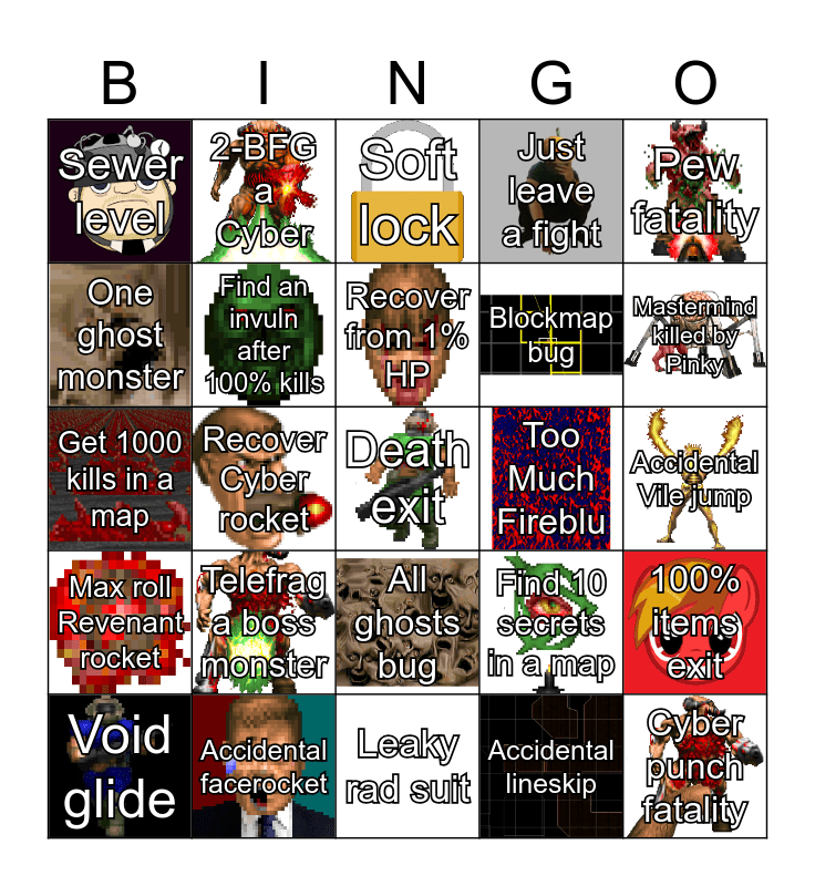 This bingo card has 24 images and 25 words: Telefrag a boss monster, Leaky rad suit, Recover from 1% HP, Void glide, Pew fatality, Sewer level, One ghost monster, 2-BFG a Cyber, Too Much Fireblu, All ghosts bug, Blockmap bug, Get 1000 kills in a map, Find 10 secrets in a map, 100% items exit, Find an invuln after 100% kills, Cyber punch fatality, Accidental Vile jump, Soft lock, Mastermind killed by Pinky, Recover Cyber rocket, Death exit, Accidental facerocket, Max roll Revenant rocket, Just leave a fight and Accidental lineskip.