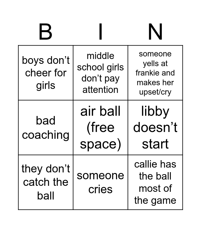 This bingo card has a free space and 10 words: someone cries, someone yells at frankie and makes her upset/cry, boys don’t cheer for girls, callie has the ball most of the game, bad coaching, they don’t catch the ball, middle school girls don’t pay attention, someone yells at someone else, libby doesn’t start and frankie carries.