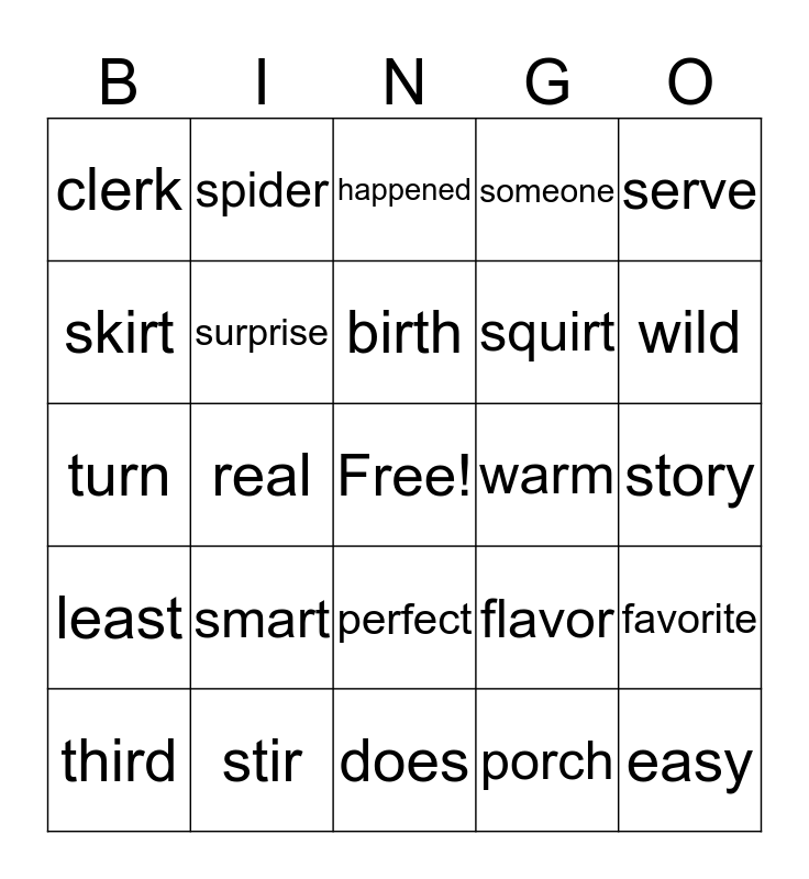 This bingo card has a free space and 24 words: smart, stir, birth, third, serve, clerk, skirt, spider, warm, perfect, squirt, turn, flavor, favorite, surprise, porch, story, happened, wild, real, easy, least, someone and does.