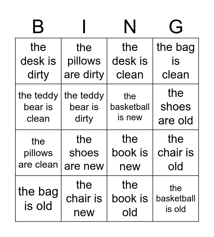 This bingo card has 16 words: the chair is new, the chair is old, the desk is clean, the desk is dirty, the pillows are clean, the pillows are dirty, the book is new, the book is old, the teddy bear is clean, the teddy bear is dirty, the bag is old, the bag is clean, the shoes are new, the shoes are old, the basketball is new and the basketball is old.