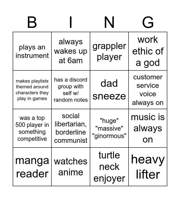 This bingo card has 16 words: watches anime, music is always on, grappler player, plays an instrument, was a top 500 player in something competitive, always wakes up at 6am, "huge" "massive" "ginormous", turtle neck enjoyer, makes playlists themed around characters they play in games, has a discord group with self w/ random notes, manga reader, work ethic of a god, social libertarian, borderline communist, customer service voice always on, dad sneeze and heavy lifter.