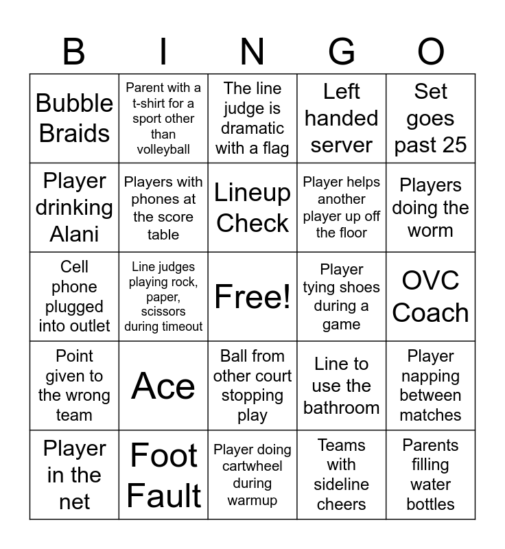 This bingo card has a free space and 24 words: Ace, Foot Fault, Lineup Check, Player in the net, Set goes past 25, Bubble Braids, Player drinking Alani, Parent with a t-shirt for a sport other than volleyball, Player tying shoes during a game, Ball from other court stopping play, Player helps another player up off the floor, Cell phone plugged into outlet, Line to use the bathroom, Player napping between matches, Players with phones at the score table, Teams with sideline cheers, OVC Coach, The line judge is dramatic with a flag, Players doing the worm, Line judges playing rock, paper, scissors during timeout, Parents filling water bottles, Point given to the wrong team, Left handed server and Player doing cartwheel during warmup.