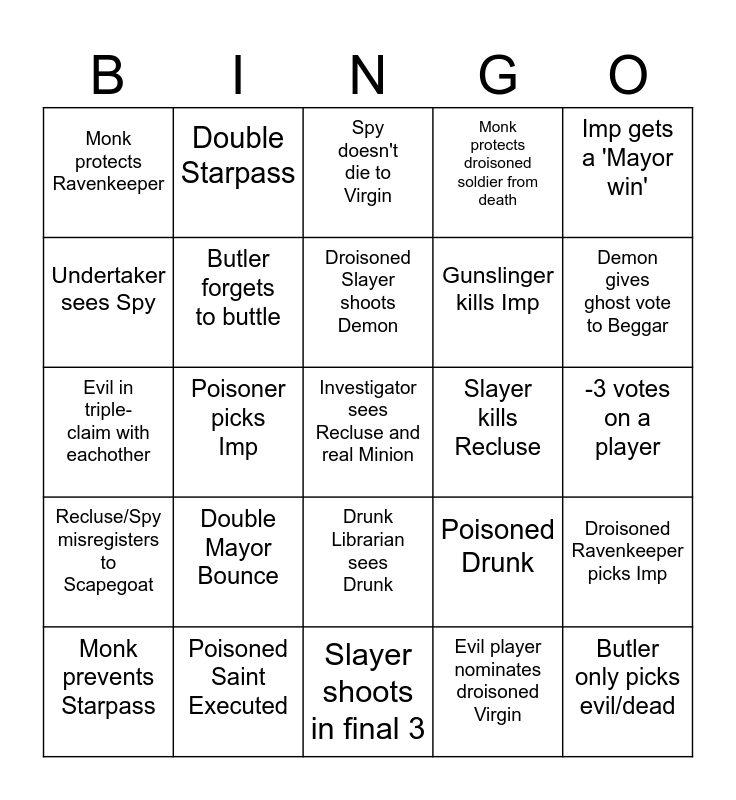 This bingo card has a free space and 24 words: Double Mayor Bounce, Poisoned Saint Executed, Droisoned Slayer shoots Demon, Monk prevents Starpass, Imp gets a 'Mayor win', Monk protects Ravenkeeper, Undertaker sees Spy, Double Starpass, Slayer kills Recluse, Drunk Librarian sees Drunk, Gunslinger kills Imp, Evil in triple-claim with eachother, Poisoned Drunk, Droisoned Ravenkeeper picks Imp, Butler forgets to buttle, Evil player nominates droisoned Virgin, -3 votes on a player, Spy doesn't die to Virgin, Demon gives ghost vote to Beggar, Poisoner picks Imp, Butler only picks evil/dead, Recluse/Spy misregisters to Scapegoat, Monk protects droisoned soldier from death and Slayer shoots in final 3.