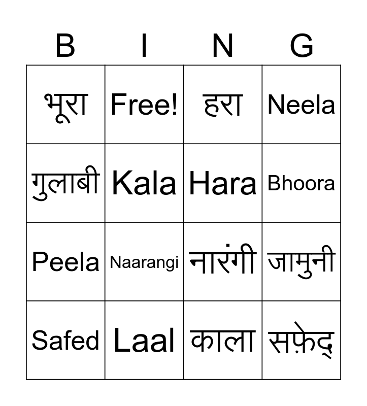 This bingo card has 19 words: नारंगी, नीला, हरा, सफ़ेद्, जामुनी, गुलाबी, काला, भूरा, Free!, Peela, Naarangi, Kala, Hara, Laal, Safed, Gulabi, Neela, Bhoora and Jamuni.
