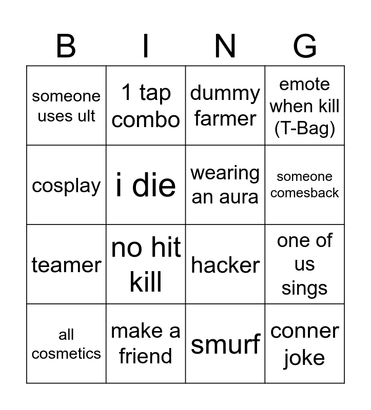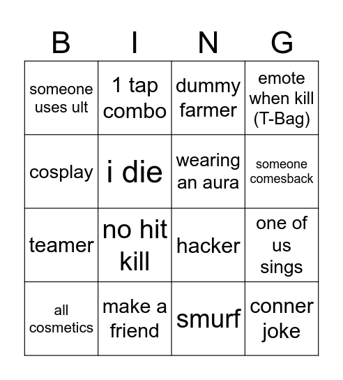 This bingo card has 24 words: furry, get a kill, someone comesback, runner, cosplay, someone uses ult, i die, 1 tap combo, make a friend, friendly, teamer, hacker, leaves, someone whos afk, wearing an aura, has divine wheel, smurf, dummy farmer, no hit kill, one of us sings, all cosmetics, conner joke, emote when kill (T-Bag) and play minesweeper.