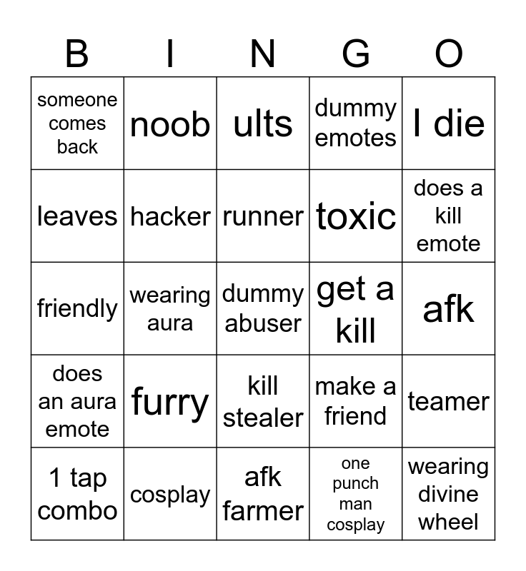 This bingo card has a free space and 24 words: furry, cosplay, runner, 1 tap combo, I die, someone comes back, leaves, noob, get a kill, kill stealer, toxic, friendly, make a friend, teamer, hacker, one punch man cosplay, afk, ults, does a kill emote, wearing aura, wearing divine wheel, does an aura emote, dummy emotes and afk farmer.