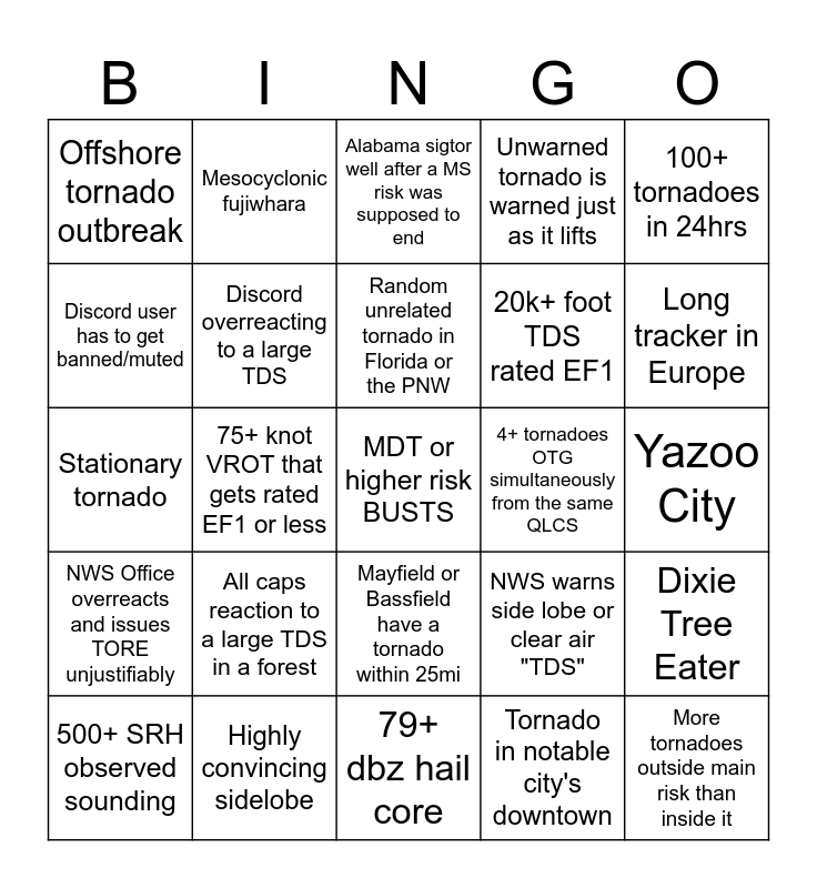This bingo card has a free space and 28 words: Dixie Tree Eater, Tornado nearly destroys a plains radar, 20k+ foot TDS rated EF1, Tornado in notable city's downtown, Discord user has to get banned/muted, Alabama sigtor well after a MS risk was supposed to end, Mesocyclonic fujiwhara, NWS Office overreacts and issues TORE unjustifiably, 4+ tornadoes OTG simultaneously from the same QLCS, 500+ SRH observed sounding, Stationary tornado, Unwarned tornado is warned just as it lifts, Highly convincing sidelobe, 79+ dbz hail core, Long tracker in Europe, Inexplicable storm behavior near KMOB, All caps reaction to a large TDS in a forest, Discord overreacting to a large TDS, Random unrelated tornado in Florida or the PNW, Mayfield or Bassfield have a tornado within 25mi, Offshore tornado outbreak, User in chat posts images of tornado live, More tornadoes outside main risk than inside it, 75+ knot VROT that gets rated EF1 or less, Yazoo City, NWS warns side lobe or clear air "TDS", 100+ tornadoes in 24hrs and <$1000 Home Depot Shed rated EF2+.