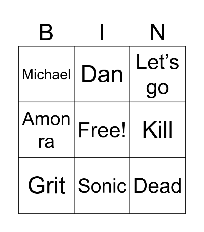 This bingo card has a free space and 8 words: Kill, Let’s go, Dan, Grit, Michael, Dead, Amon ra and Sonic.