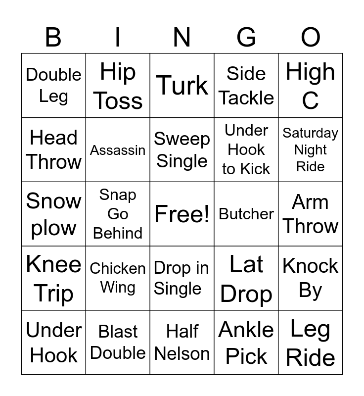 This bingo card has a free space and 26 words: Drop in Single, Ankle Pick, Sweep Single, Blast Double, High C, Double Leg, Head Throw, Hip Toss, Arm Throw, Lat Drop, Under Hook to Kick, Snow plow, Knock By, Under Hook, Snap Go Behind, Slide By, Side Tackle, Knee Trip, Turk, Leg Ride, Saturday Night Ride, Half Nelson, Butcher, Chicken Wing, Assassin and Near Arm Far Leg.