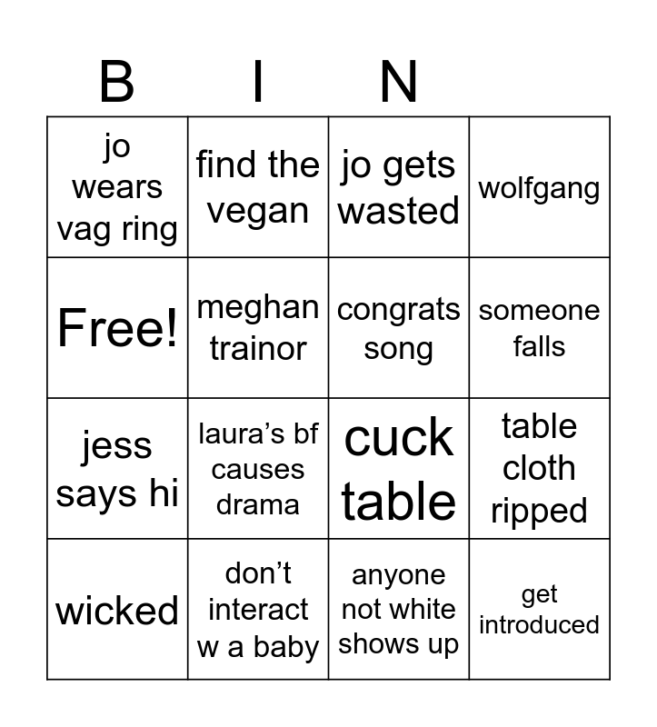 This bingo card has 16 words: don’t interact w a baby, table cloth ripped, jo gets wasted, jo wears vag ring, jess says hi, find the vegan, cuck table, anyone not white shows up, Free!, meghan trainor, wicked, wolfgang, laura’s bf causes drama, someone falls, congrats song and get introduced.