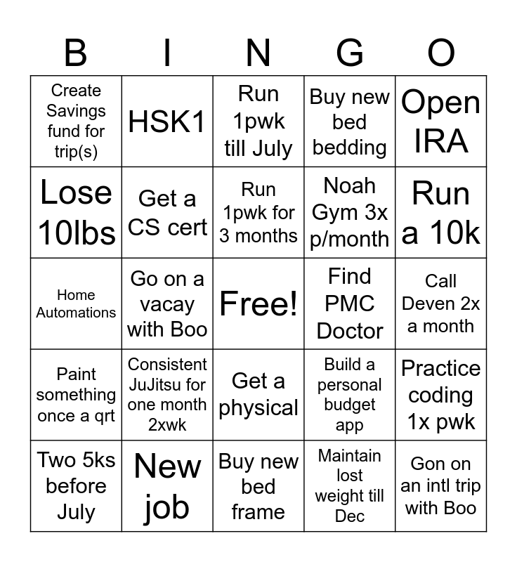 This bingo card has a free space and 24 words: Consistent JuJitsu for one month 2xwk, New job, Run 1pwk for 3 months, Two 5ks before July, Open IRA, Create Savings fund for trip(s), Lose 10lbs, HSK1, Find PMC Doctor, Get a physical, Noah Gym 3x p/month, Home Automations, Build a personal budget app, Practice coding 1x pwk, Get a CS cert, Maintain lost weight till Dec, Call Deven 2x a month, Run 1pwk till July, Run a 10k, Go on a vacay with Boo, Gon on an intl trip with Boo, Paint something once a qrt, Buy new bed bedding and Buy new bed frame.