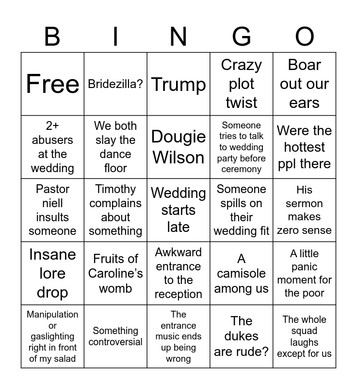 This bingo card has a free space and 24 words: Fruits of Caroline’s womb, Something controversial, Dougie Wilson, Manipulation or gaslighting right in front of my salad, Boar out our ears, Free, 2+ abusers at the wedding, Bridezilla?, Someone spills on their wedding fit, Awkward entrance to the reception, Someone tries to talk to wedding party before ceremony, Pastor niell insults someone, A camisole among us, A little panic moment for the poor, We both slay the dance floor, The dukes are rude?, His sermon makes zero sense, Trump, Were the hottest ppl there, Timothy complains about something, The whole squad laughs except for us, Insane lore drop, Crazy plot twist and The entrance music ends up being wrong.