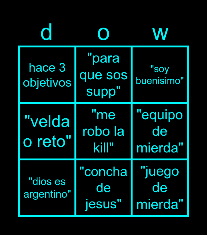 This bingo card has 9 words: "dios es argentino", "soy buenisimo", "para que sos supp", "velda o reto", hace 3 objetivos, "equipo de mierda", "me robo la kill", "juego de mierda" and "concha de jesus".