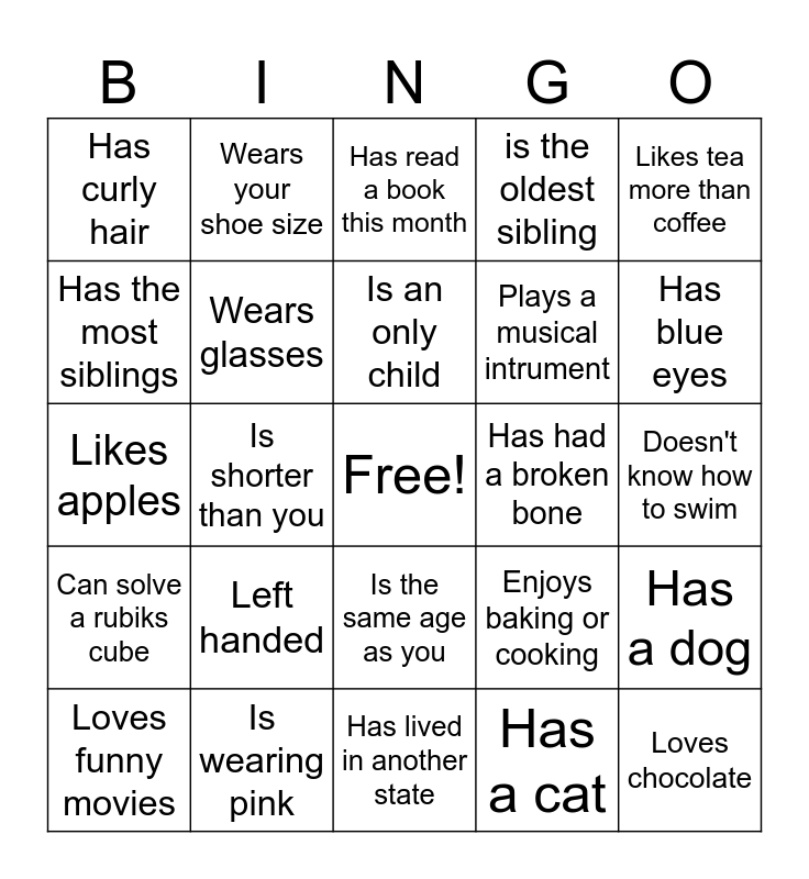 This bingo card has a free space and 24 words: Left handed, Is wearing pink, Is an only child, Loves funny movies, Likes tea more than coffee, Has curly hair, Has the most siblings, Wears your shoe size, Has had a broken bone, Is the same age as you, Plays a musical intrument, Likes apples, Enjoys baking or cooking, Has a dog, Wears glasses, Has a cat, Doesn't know how to swim, Has read a book this month, Has blue eyes, Is shorter than you, Loves chocolate, Can solve a rubiks cube, is the oldest sibling and Has lived in another state.