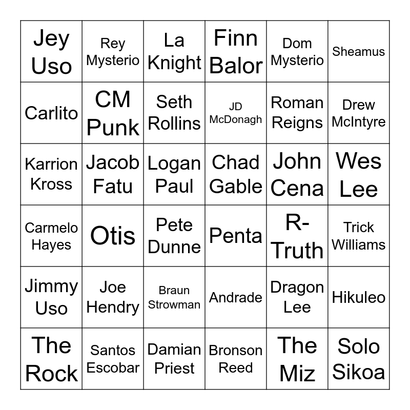 This bingo card has 36 words: Andrade, Braun Strowman, Bronson Reed, Carlito, Carmelo Hayes, Chad Gable, CM Punk, Damian Priest, Dom Mysterio, Dragon Lee, Drew McIntyre, Finn Balor, Hikuleo, Jacob Fatu, JD McDonagh, Jey Uso, Jimmy Uso, John Cena, Karrion Kross, La Knight, Logan Paul, Otis, Penta, Pete Dunne, R-Truth, Rey Mysterio, Roman Reigns, Santos Escobar, Seth Rollins, Sheamus, Solo Sikoa, The Rock, Trick Williams, Wes Lee, Joe Hendry and The Miz.