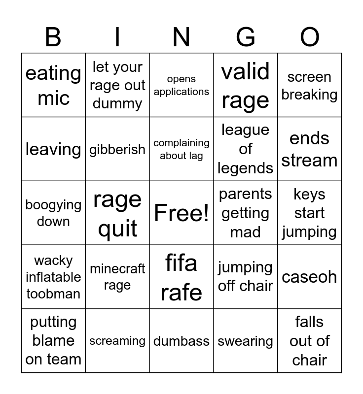 This bingo card has a free space and 24 words: minecraft rage, screaming, complaining about lag, putting blame on team, screen breaking, eating mic, leaving, let your rage out dummy, parents getting mad, fifa rafe, league of legends, boogying down, jumping off chair, caseoh, gibberish, swearing, keys start jumping, opens applications, ends stream, rage quit, falls out of chair, wacky inflatable toobman, valid rage and dumbass.