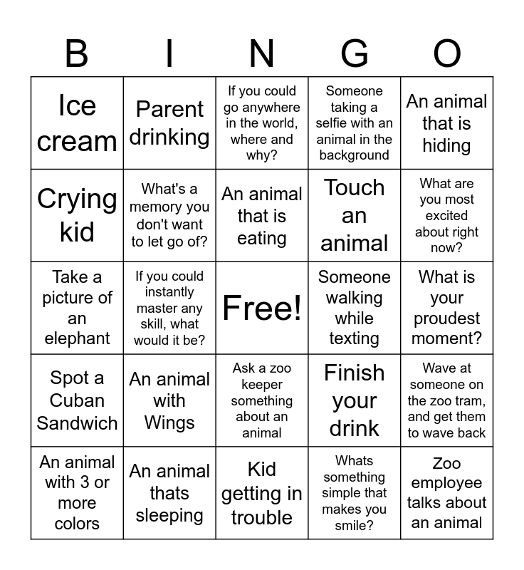This bingo card has a free space and 24 words: An animal with Wings, An animal thats sleeping, An animal that is eating, An animal with 3 or more colors, An animal that is hiding, Ice cream, Crying kid, Parent drinking, Someone walking while texting, Ask a zoo keeper something about an animal, Touch an animal, Take a picture of an elephant, Finish your drink, Wave at someone on the zoo tram, and get them to wave back, What's a memory you don't want to let go of?, Whats something simple that makes you smile?, What is your proudest moment?, If you could go anywhere in the world, where and why?, What are you most excited about right now?, If you could instantly master any skill, what would it be?, Zoo employee talks about an animal, Spot a Cuban Sandwich, Someone taking a selfie with an animal in the background and Kid getting in trouble.