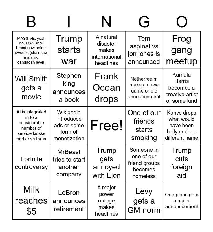This bingo card has a free space and 24 words: MrBeast tries to start another company, LeBron announces retirement, Frank Ocean drops, Milk reaches $5, Frog gang meetup, MASSIVE, yeah no, MASSIVE brand new anime sweeps (chainsaw man, jjk, dandadan level), Will Smith gets a movie, Trump starts war, One of our friends starts smoking, Trump gets annoyed with Elon, Netherrealm makes a new game or dlc announcement, AI is integrated in to a considerable number of service kiosks and drive thrus, Someone in one of our friend groups becomes homeless, Trump cuts foreign aid, Stephen king announces a book, Levy gets a GM norm, Kanye drops what would have been bully under a different name, A natural disaster makes international headlines, Kamala Harris becomes a creative artist of some kind, Wikipedia introduces ads or some form of monetization, One piece gets a major announcement, Fortnite controversy, Tom aspinal vs jon jones is announced and A major power outage makes headlines.