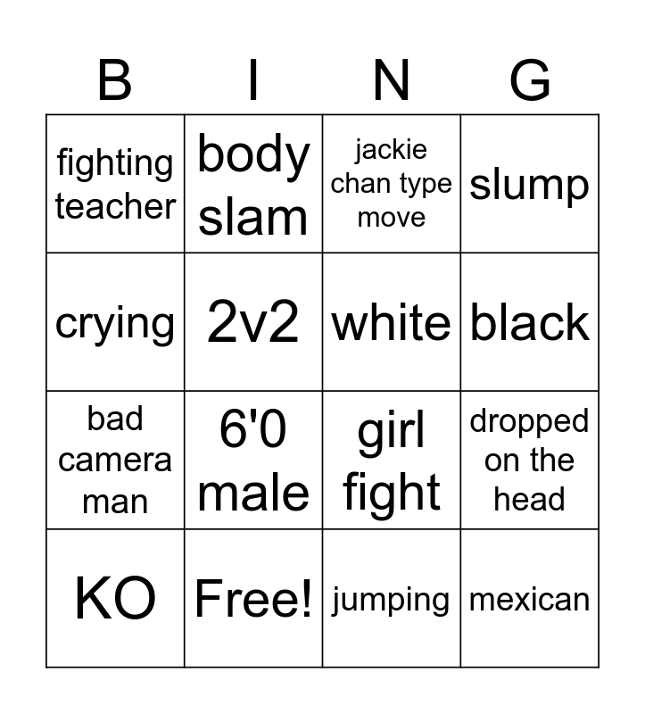 This bingo card has 16 words: Free!, dropped on the head, jackie chan type move, fighting teacher, bad camera man, body slam, girl fight, jumping, crying, 2v2, KO, slump, 6'0 male, black, white and mexican.