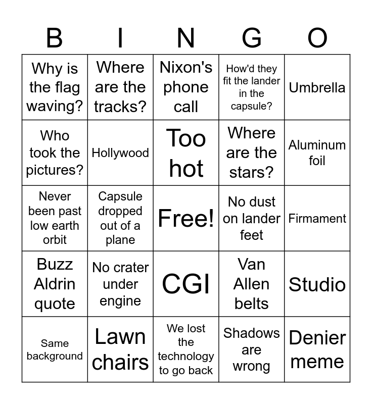 This bingo card has a free space and 26 words: CGI, Shadows are wrong, Too hot, Lawn chairs, Umbrella, Why is the flag waving?, Who took the pictures?, Where are the tracks?, Firmament, Van Allen belts, Where are the stars?, Never been past low earth orbit, Studio, Same background, Capsule dropped out of a plane, Jeep chassis, How'd they fit the lander in the capsule?, Buzz Aldrin quote, Nixon's phone call, Denier meme, Aluminum foil, We lost the technology to go back, No dust on lander feet, No crater under engine, Hollywood and Cameras weren't that good back then.