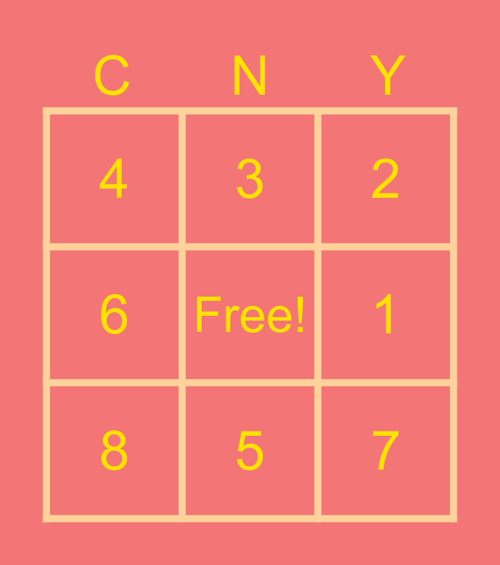 This bingo card has a free space and 8 words: 1, 2, 3, 8, 4, 7, 6 and 5.