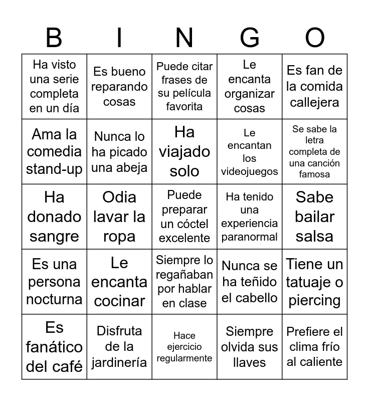 This bingo card has a free space and 24 words: Le encanta cocinar, Disfruta de la jardinería, Ha viajado solo, Es fanático del café, Es fan de la comida callejera, Ha visto una serie completa en un día, Ama la comedia stand-up, Es bueno reparando cosas, Ha tenido una experiencia paranormal, Siempre lo regañaban por hablar en clase, Le encantan los videojuegos, Ha donado sangre, Nunca se ha teñido el cabello, Tiene un tatuaje o piercing, Nunca lo ha picado una abeja, Siempre olvida sus llaves, Sabe bailar salsa, Puede citar frases de su película favorita, Se sabe la letra completa de una canción famosa, Odia lavar la ropa, Prefiere el clima frío al caliente, Es una persona nocturna, Le encanta organizar cosas and Hace ejercicio regularmente.