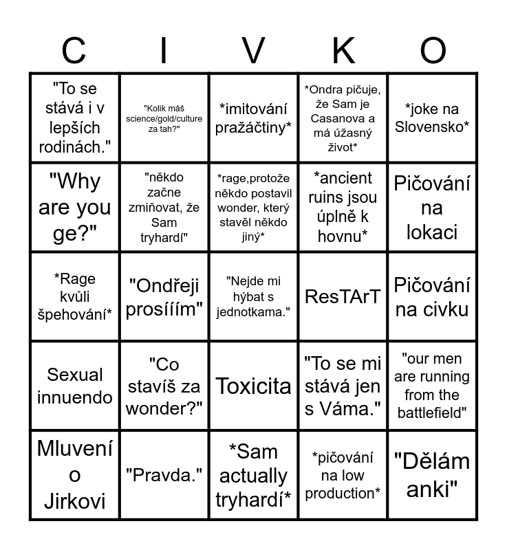 This bingo card has 33 words: "Dělám anki", "To je nabídka, která se neodmítá", "Ondřeji prosííím", "Proč jsou lidi tak zlý", Sexual innuendo, "někdo začne zmiňovat, že Sam tryhardí", *joke na Slovensko*, Mluvení o Jirkovi, "Kolik máš science/gold/culture za tah?", Incense? More like incest!, *rage,protože někdo postavil wonder, který stavěl někdo jiný*, *imitování pražáčtiny*, Free!, Klobása = ano prosíím, ResTArT, Pičování na lokaci, "Pravda.", *Rage kvůli špehování*, "Co stavíš za wonder?", "To se mi stává jen s Váma.", Toxicita, *někdo začne zpívat random songu*, "To se stává i v lepších rodinách.", Pičování na civku, *Sam actually tryhardí*, "Nejde mi hýbat s jednotkama.", *Ondra pičuje, že Sam je Casanova a má úžasný život*, *ancient ruins jsou úplně k hovnu*, "Why are you ge?", "our men are running from the battlefield", *pičování na barbary*, *pičování na low production* and *tah trvá moc dlouho*.