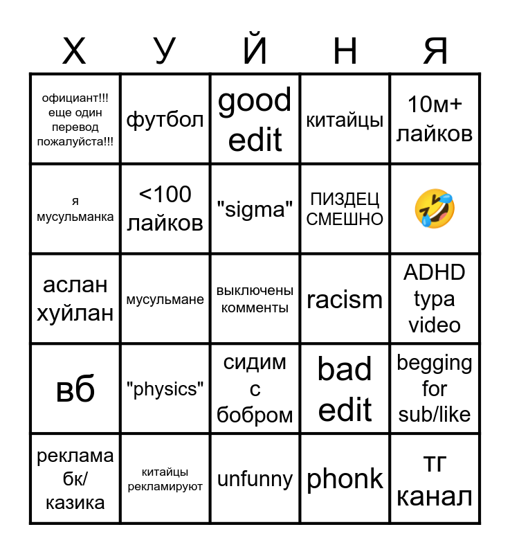 This bingo card has 55 words: момент из фильма, реклама бк/казика, мотоциклы, официант!!! еще один перевод пожалуйста!!!, unfunny, cringe, <100 лайков, пиздец интересные факты, ПИЗДЕЦ СМЕШНО, brainrot, китайцы, CGI, cats, парочка долбаёбов, игра в хуесоса, индусы, 10м+ лайков, мусульмане, еда, выключены комменты, racism, skull/trollface, bad edit, good edit, нарезка, "sigma", phonk, no reaction reactor, ADHD typa video, begging for sub/like, бренд, долбаёбский монтаж, еблан на публике, #юмор, я мусульманка, аслан хуйлан, хуйня с телевизора, вб, тг канал, плюнул бы в ебало, футбол, "аллах", обоюдно, танцуют, "physics", китайцы рекламируют, арабы, испанцы, литвин, 🤣, математика, печеньец из игры в долбаёба, Я ПОПРОБОВАЛА..., сидим с бобром and Я КУПИЛ....