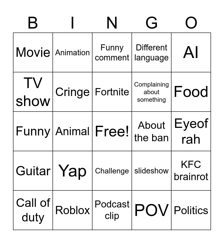 This bingo card has a free space and 24 words: Yap, Roblox, Fortnite, Call of duty, AI, Movie, TV show, Animation, About the ban, Challenge, Complaining about something, Funny, slideshow, KFC brainrot, Cringe, POV, Eyeof rah, Funny comment, Food, Animal, Politics, Guitar, Different language and Podcast clip.