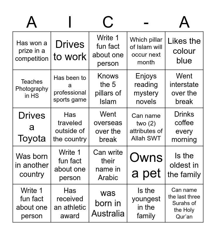 This bingo card has a free space and 24 words: Write 1 fun fact about one person, Has received an athletic award, Knows the 5 pillars of Islam, Write 1 fun fact about one person, Likes the colour blue, Has won a prize in a competition, Teaches Photography in HS, Drives to work, Can name two (2) attributes of Allah SWT, Can write their name in Arabic, Enjoys reading mystery novels, Drives a Toyota, Owns a pet, Is the oldest in the family, Has been to a professional sports game, Is the youngest in the family, Drinks coffee every morning, Write 1 fun fact about one person, Went interstate over the break, Has traveled outside of the country, Can name the last three Surahs of the Holy Qur’an, Was born in another country, Which pillar of Islam will occur next month and was born in Australia.