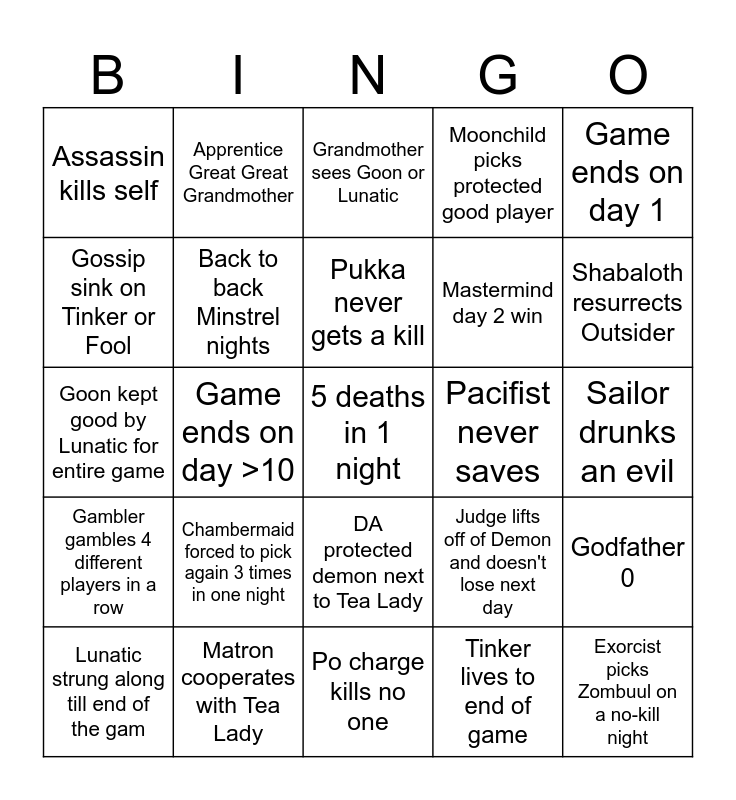 This bingo card has a free space and 24 words: Chambermaid forced to pick again 3 times in one night, Matron cooperates with Tea Lady, Pukka never gets a kill, Lunatic strung along till end of the gam, Game ends on day 1, Assassin kills self, Gossip sink on Tinker or Fool, Apprentice Great Great Grandmother, Pacifist never saves, DA protected demon next to Tea Lady, Mastermind day 2 win, Goon kept good by Lunatic for entire game, Judge lifts off of Demon and doesn't lose next day, Godfather 0, Back to back Minstrel nights, Tinker lives to end of game, Sailor drunks an evil, Grandmother sees Goon or Lunatic, Shabaloth resurrects Outsider, Game ends on day >10, Exorcist picks Zombuul on a no-kill night, Gambler gambles 4 different players in a row, Moonchild picks protected good player and Po charge kills no one.