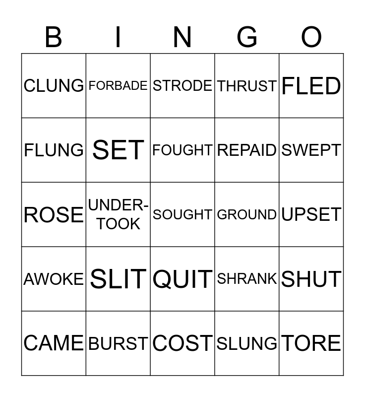 This bingo card has a free space and 24 words: SLIT, BURST, FOUGHT, CAME, FLED, CLUNG, FLUNG, FORBADE, GROUND, QUIT, REPAID, ROSE, SHRANK, SHUT, SET, SLUNG, UPSET, STRODE, SWEPT, UNDER-TOOK, TORE, AWOKE, THRUST and COST.