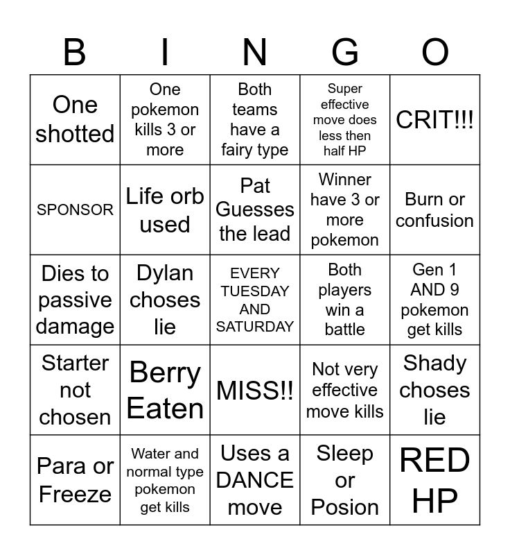 This bingo card has a free space and 24 words: Para or Freeze, Berry Eaten, Pat Guesses the lead, Sleep or Posion, CRIT!!!, One shotted, One pokemon kills 3 or more, Both teams have a fairy type, Both players win a battle, Gen 1 AND 9 pokemon get kills, Dies to passive damage, Life orb used, Not very effective move kills, Shady choses lie, SPONSOR, Water and normal type pokemon get kills, Uses a DANCE move, Super effective move does less then half HP, Burn or confusion, Starter not chosen, Dylan choses lie, MISS!!, Winner have 3 or more pokemon and RED HP.