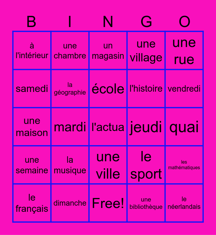 This bingo card has 32 words: Free!, lundi, mardi, mercredi, jeudi, vendredi, samedi, dimanche, école, gare, quai, à l'intérieur, dehors, hôpital, l'histoire, le néerlandais, le français, la géographie, l'actua, le sport, les mathématiques, les arts, la musique, une ville, une village, une rue, une maison, une chambre, un magasin, une bibliothèque, la religion and une semaine.