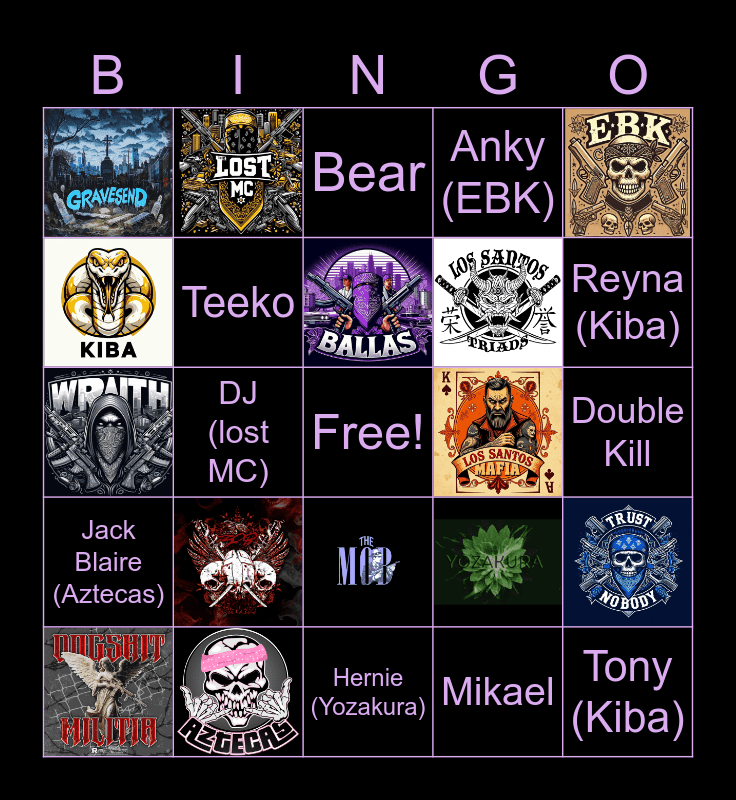 This bingo card has 14 images, a free space and 10 words: Teeko, Mikael, Double Kill, Bear, Reyna (Kiba), DJ (lost MC), Tony (Kiba), Jack Blaire (Aztecas), Anky (EBK) and Hernie (Yozakura).
