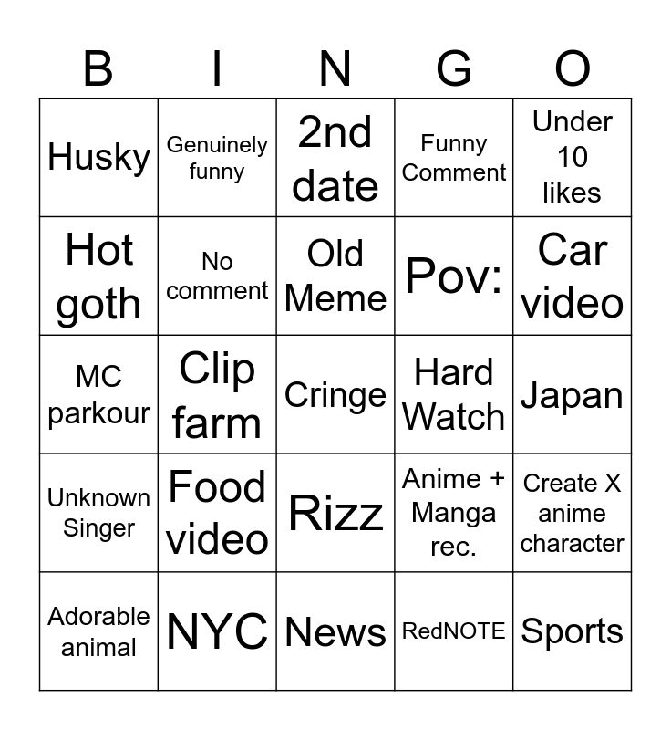 This bingo card has a free space and 24 words: Food video, NYC, Old Meme, Adorable animal, Under 10 likes, Husky, Hot goth, Genuinely funny, Hard Watch, Rizz, Pov:, MC parkour, Anime + Manga rec., Create X anime character, No comment, RedNOTE, Japan, 2nd date, Car video, Clip farm, Sports, Unknown Singer, Funny Comment and News.