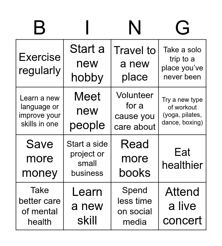 This bingo card has 16 words: Learn a new skill, Eat healthier, Travel to a new place, Exercise regularly, Save more money, Start a new hobby, Read more books, Spend less time on social media, Learn a new language or improve your skills in one, Meet new people, Take better care of mental health, Take a solo trip to a place you’ve never been, Start a side project or small business, Try a new type of workout (yoga, pilates, dance, boxing), Volunteer for a cause you care about and Attend a live concert.