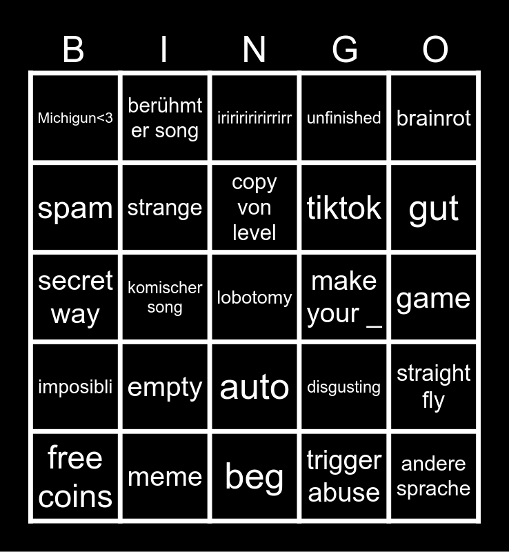 This bingo card has 25 words: empty, beg, copy von level, free coins, brainrot, Michigun<3, spam, berühmt er song, make your _, auto, tiktok, secret way, disgusting, straight fly, strange, andere sprache, game, iriririririrrirr, gut, komischer song, lobotomy, meme, imposibli, unfinished and trigger abuse.