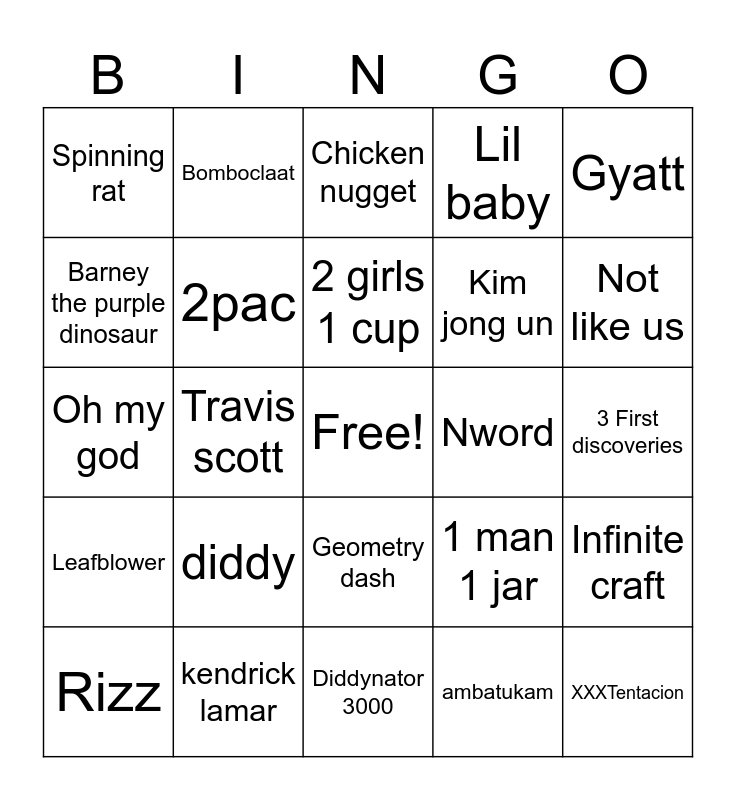 This bingo card has a free space and 24 words: diddy, kendrick lamar, 2 girls 1 cup, Rizz, Gyatt, Spinning rat, Barney the purple dinosaur, Bomboclaat, Nword, Geometry dash, Kim jong un, Oh my god, 1 man 1 jar, Infinite craft, 2pac, ambatukam, 3 First discoveries, Chicken nugget, Not like us, Travis scott, XXXTentacion, Leafblower, Lil baby and Diddynator 3000.